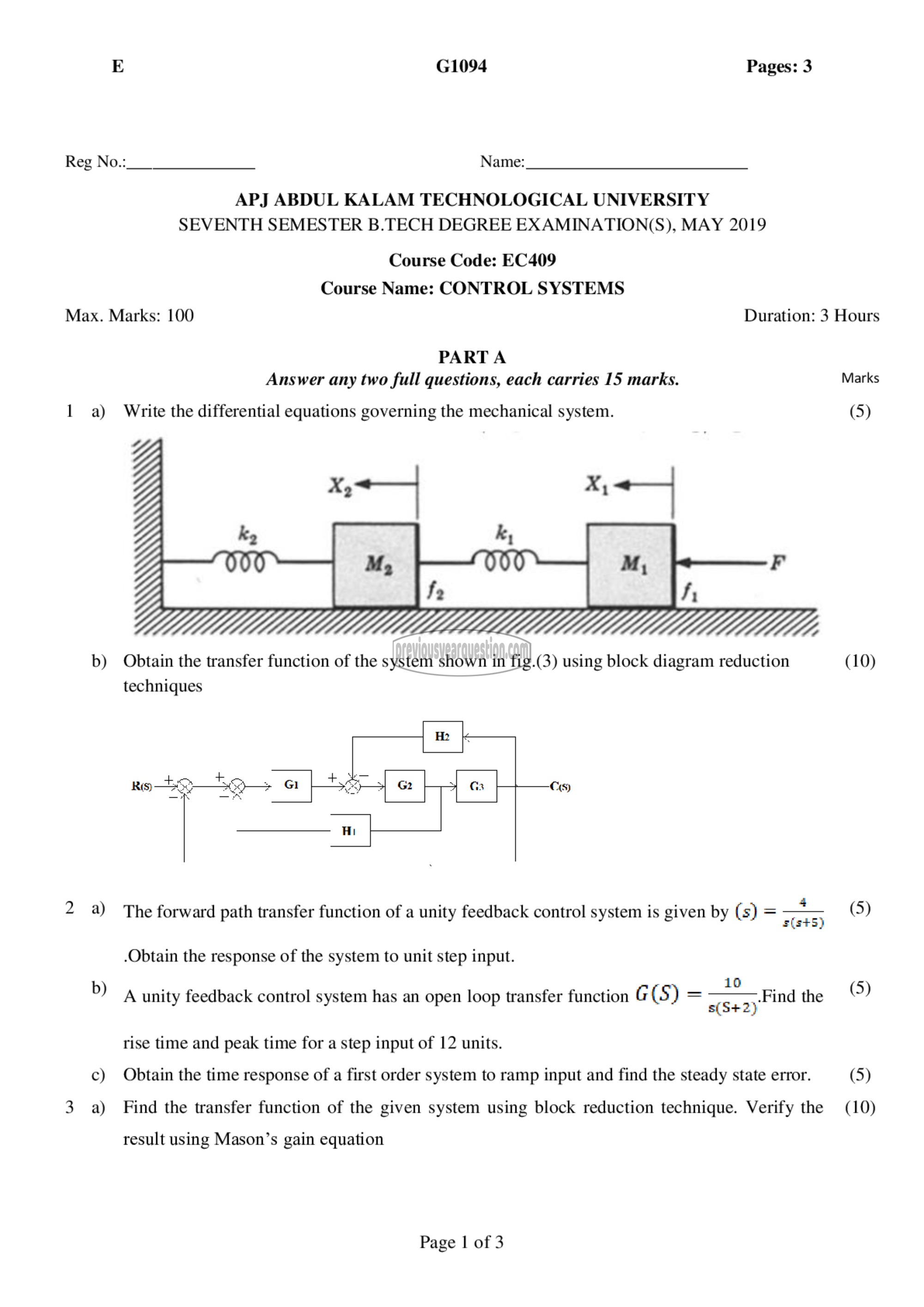 b) Obtain the transfer function of the system shown in fig.(3) using block diagram reduction (10)